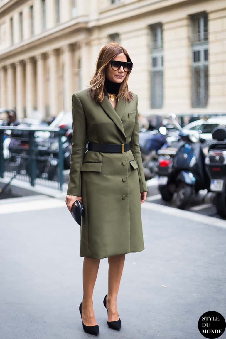 But if you wanna turn the heat on there are so many powerful options. Think stiletto heels, bold lips and khaki dress, pencil skirt, jumpsuits, structured coats, trench coats, shirt dresses. The sky’s the limit.