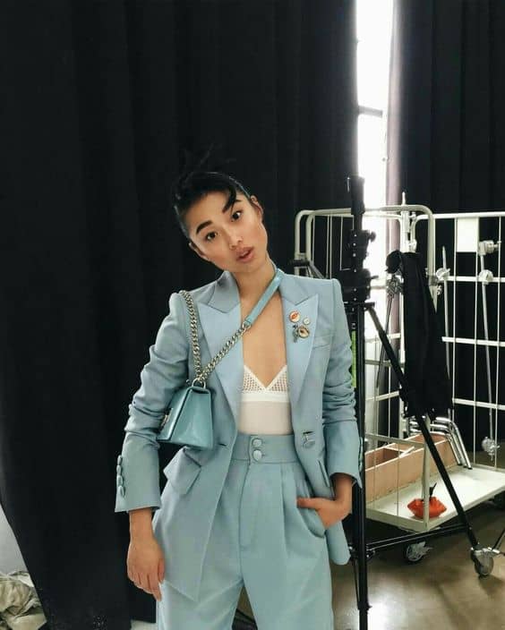 It’s like mixing coffee and milk, night and day, powerful and dainty. Baby blues, pinks, and mint greens or light yellows look amazing in either powersuits that’re more classic, or the more oversized, masculine styles.